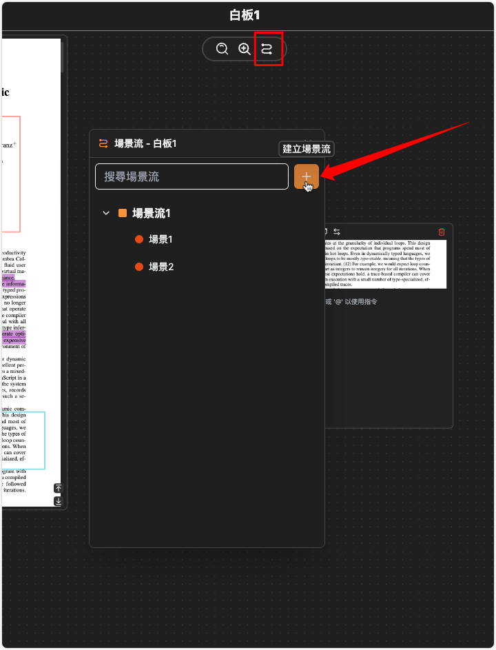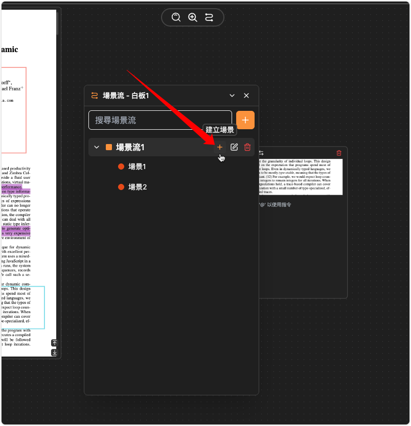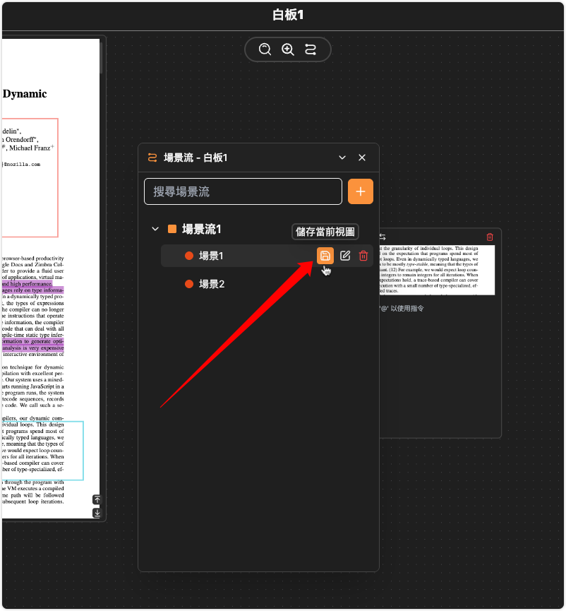 场景流功能专为白板和思维导图设计,让您能够快速定位到常用的位置和缩放级别,提高编辑效率。